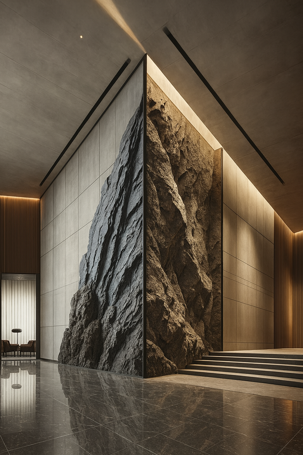 Interior of a modern building with a tall, textured rock feature wall, illuminated by warm lighting, with stairs and seating area in the background.